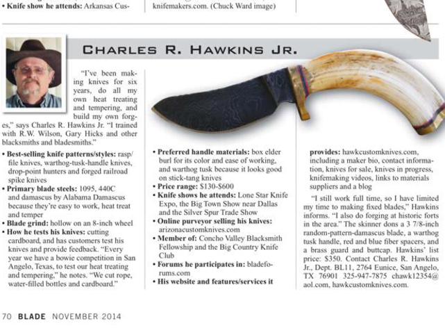 Hi my name is Charles R. Hawkins Jr. I live in San Angelo, Texas. I have been married to my wife Terrie for 47 yrs and have 2 great boys. I have been making knives for a little over 17 years. I trained locally with Cham Chambless, Bart Burnett and Joe Gibson. I trained with Gary Hicks and the late Dick Patton from Tuscola, Texas. I traveled to West Virgina and trained with R.W. Wilson for a week. I also took an advance knifemaking class from Johnny Stout in Aug. 2018. My knives are made from horse rasps files, 01 tool steel and Cpm154 stainless. I am still training in knife making. I read books and learn from anyone who will teach me. I have been lucky, I think I have had some very good teachers. I am a second Degree Black Belt in Tang Soo Do. Trained for 31 yrs. I now have 3D printed items for sale